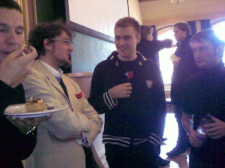 Die einen essen mitgebrachte Kuchenreste (im Bild v. l. der kuchenselige Manuel Adams sowie seine kuchenlosen Gesprächspartner Patrick Ehmann, Lukas Haffert und Markus Dankerl), …