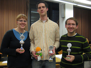 Die Turniersieger: Pauline Leopold, Peter Croonenbroeck und Christoph Krakowiak (v.l.) konnten Gutenberg-Cup-Pokale mit nach Hause nehmen. Das Mainzelmännchen für den besten Redner des Turniers ging an Peter.