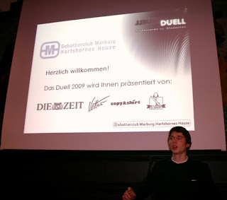 Das Thema wurde hitzig und emotional-geladen debattiert. Der Regierung aus den Clubmitgliedern Karen Bayer, Sebastian Wamser und Jan Kastell wurde trotz durchdachten Thesen das Argumentieren durch gezielte Zwischenfragen und geniale Ideen von Seiten der Professoren Uwe Wagner, Jan Koolman und Wolfgang Seitter schwer gemacht. Am Ende entschied sich das Publikum für das Oppositionsteam, also für die Professoren, die sich über eine große Torte als Siegpreis freuen konnten.